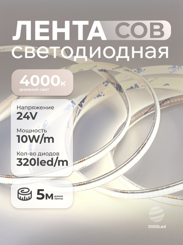Светодиодная лента 24В,10Вт, 5м, 4000К, COB нейтральный дневной свет, DIGSled Normal-C COB 320led 24V Day White 10W
