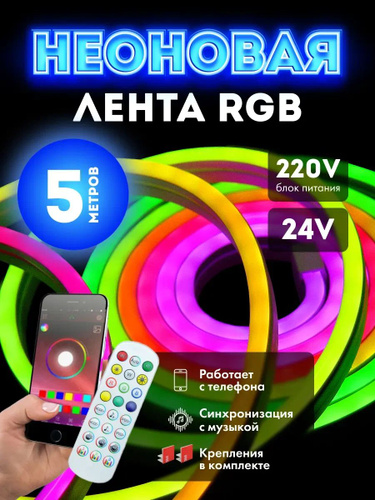 Гибкая неоновая светодиодная лента RGB 5 метров 24в c Bluetooth пультом и креплениями, подсветка на стену