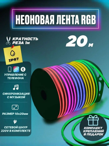 Гибкая неоновая лента RGB 220 вольт 20 метров 1x2 см влагозащищенная ргб подсветка с пультом