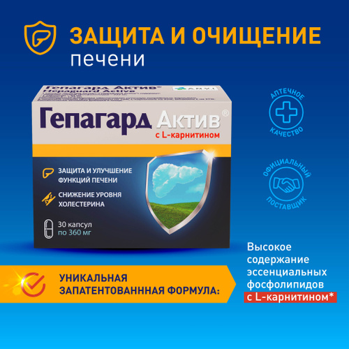 Гепагард Актив №30. Гепатопротектор с L- карнитином. Для чистки и восстановления печени, 30 капсул.