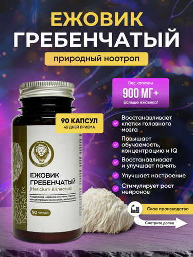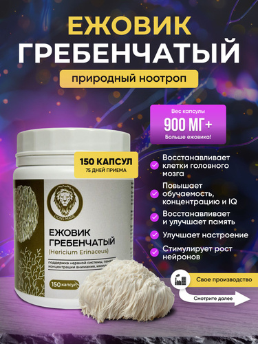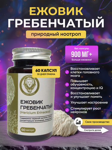 Ежовик гребенчатый Lions Mane для мозга, для памяти 60 капсул/ плодовое тело