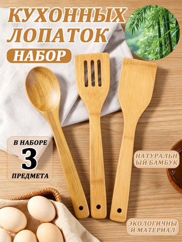 Лопатка кулинарная, набор, деревянная, для кухни, для сковороды, бамбук, 3 шт.