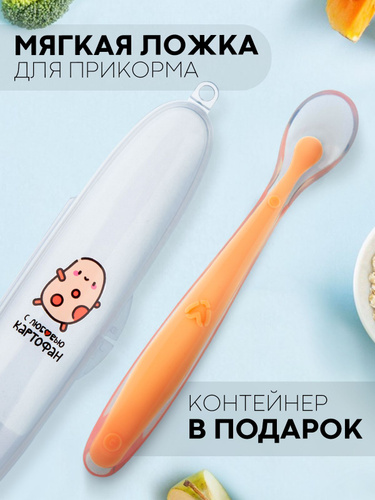 Силиконовая ложка для кормления новорожденных детей, с контейнером в комплекте (детская ложечка для прикорма), бренд КАРТОФАН, оранжевая