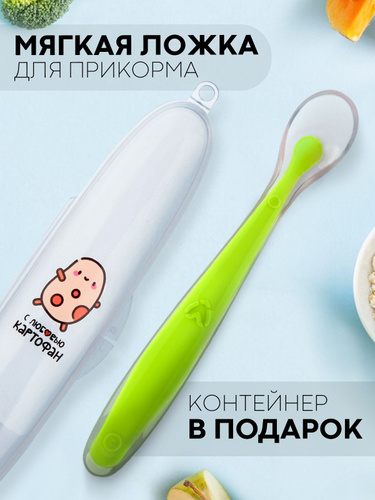 Силиконовая ложка для кормления новорожденных детей, с контейнером в комплекте (детская ложечка для прикорма), бренд КАРТОФАН, зеленая