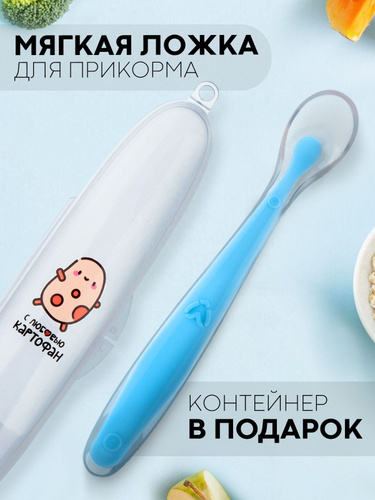 Силиконовая ложка для кормления новорожденных детей, с контейнером в комплекте (детская ложечка для прикорма), бренд КАРТОФАН, голубая