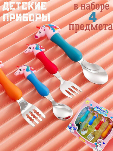 Детский набор столовых приборов для кормления и прикорма малыша, комплект 4 предмета вилка 2 шт и ложечка 2шт