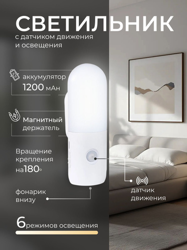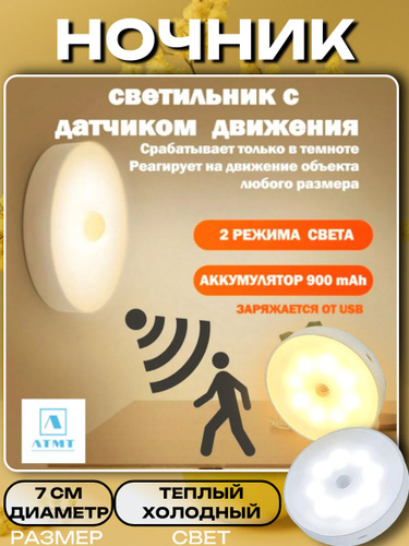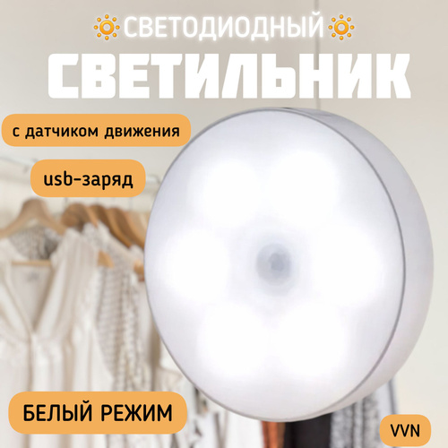 Беспроводной светодиодный LED светильник, ночник, лампа с датчиком движения на аккумуляторе (аккумулятор Li-ion 900 mAh и USB шнур в комплекте)