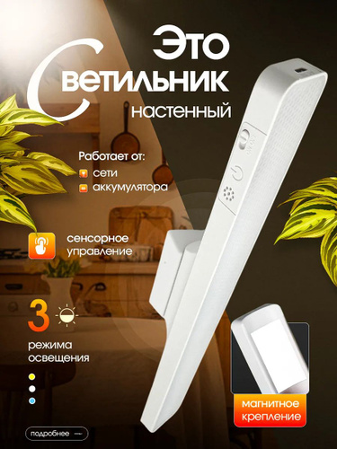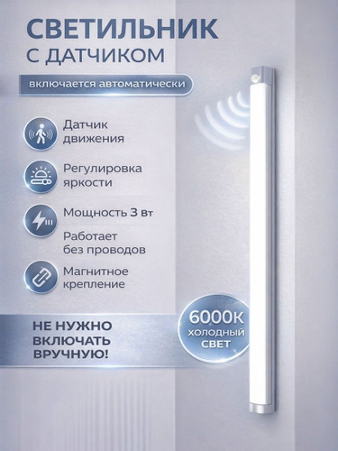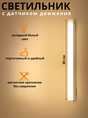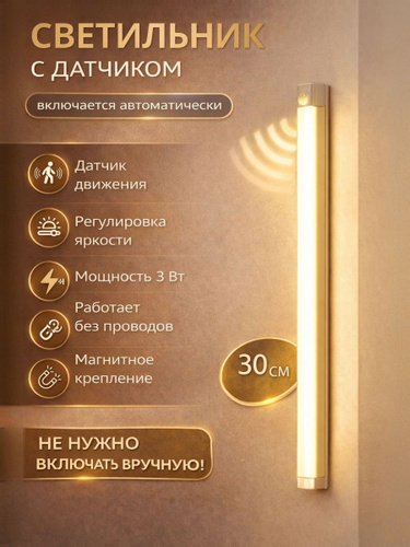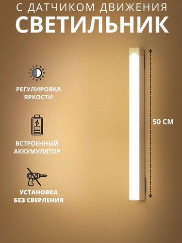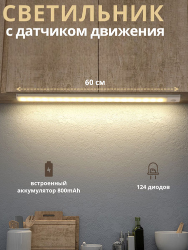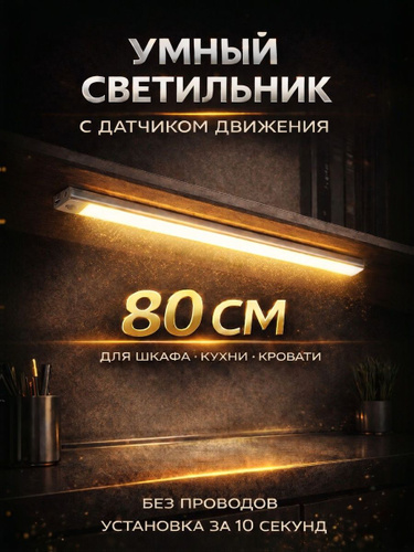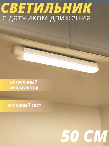Светильник с датчиком движения 40 см, беспроводная лампа, LED подсветка на кухню в шкаф, датчик света и регулируемая температура свечения, на аккумуляторе