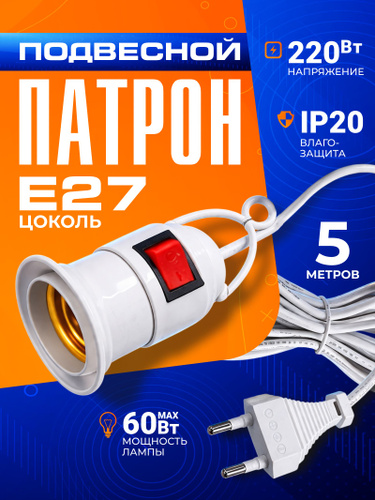 Патрон подвесной е27 с выключателем и шнуром 5 м (470 см ), патрон для лампы с выключателем для рассады и фитолампы.