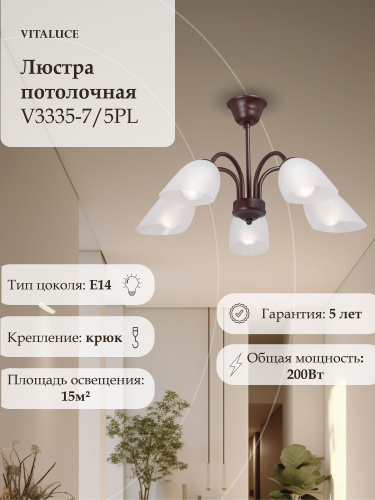 Люстра потолочная Vitaluce V3335-7/5PL , 5 ламп 15м2, Е14, макс. 40Вт, цвет коричневый матовый, плафон пластик.