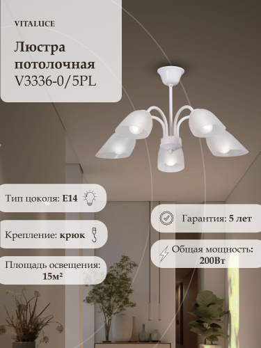 Люстра потолочная Vitaluce V33360-0/5PL, 5 ламп, E14 макс. 40Вт, плафон ПП, 15м2, цвет белый глянцевый.