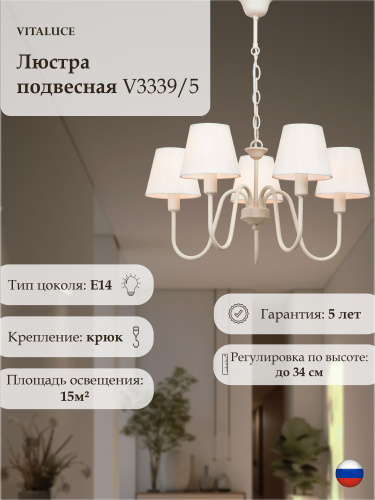Люстра подвесная Vitaluce V3339/5 , 5 ламп 15м2, Е14, 40Вт, цвет бежевый.