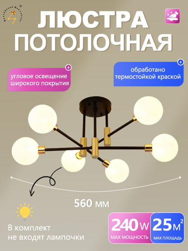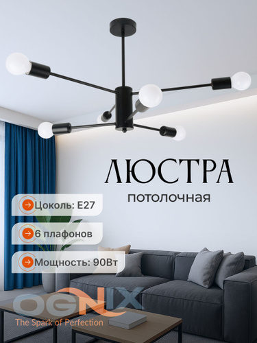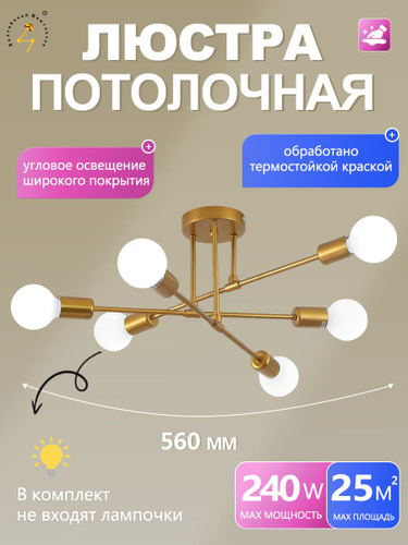 Люстра потолочная, светильник в зал, на кухню в спальню или детскую, металлический корпус в стиле лофт. 6 ламп