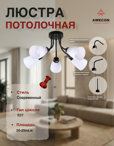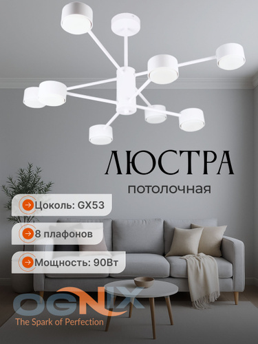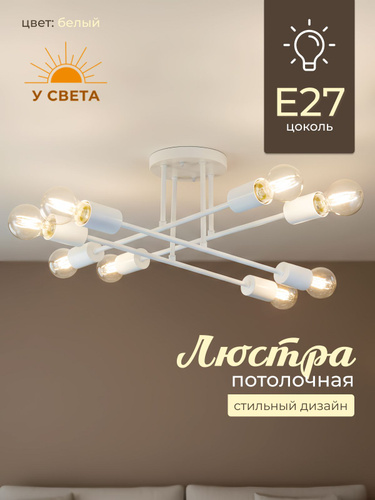 Люстра-трансформер потолочная Лофт Белый, 8 ламп, Е27, до 26 м2, в зал, в прихожую, на кухню