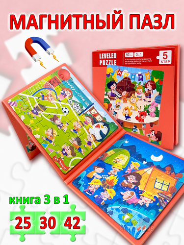 Магнитный пазл для малышей 3 в 1 / Набор пазлов разного уровня сложности, 97 деталей, Школа, темно-красный