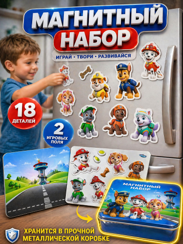 Набор магнитов для детей 3 лет "Щенячий патруль", в металлической коробке, 18 деталей, 2 игровых поля в комплекте