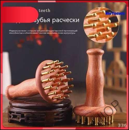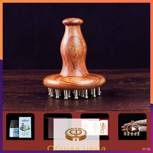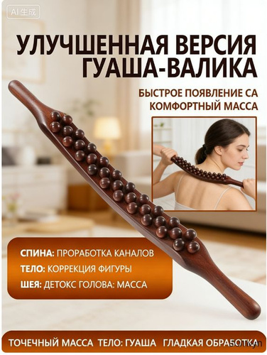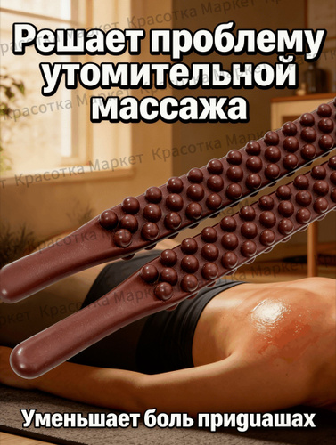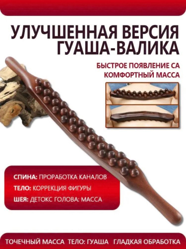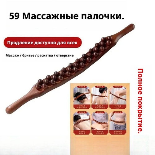 Термообработанный деревянный массажер-скребок Гуаша 59 шариков, двойная головка, три канавки, для спины и тела, 58 см, 1 шт.