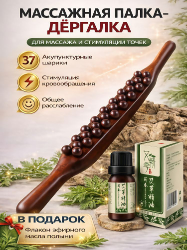 Массажная палка Гуаша 35 шарик дерево бук лимфодренажная для похудения тела живота спины шеи