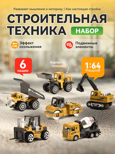 Детские игрушечные строительные машинки, Игровой набор машинок строительной техники детский , 6 предметов, подарок для мальчика самосвал, бульдозер, вилочный погрузчик, каток, цементовоз и экскаватор