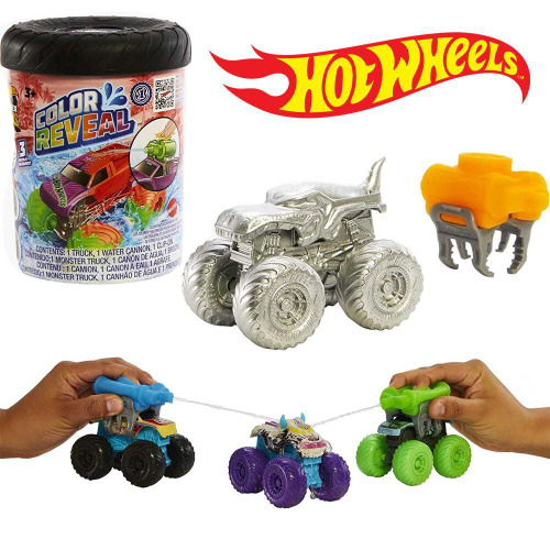 Hot Wheels Monster Trucks Color Reveal Truck, игрушечный грузовик в масштабе 1:64, меняющий цвет, с 2 чашками, крышкой и водяным бластером для измельченной машины