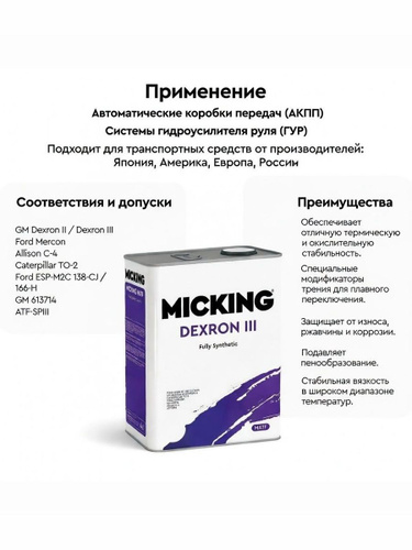 Масло трансмиссионное Micking ATF DEXRON III (4 литра) для АКПП