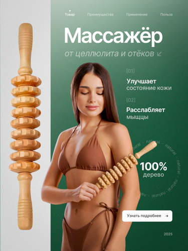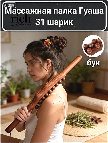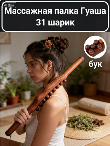Массажная палка Гуаша 31 шарик дерево бук лимфодренажная для похудения тела живота спины шеи