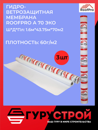 Гидро-ветрозащитная мембрана RoofPro А ЭКО, 70 м2 - 3 ШТУКИ /Гидро-пароизоляционная пленка RoofPro A
