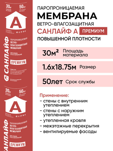 Пароизоляция САНЛАЙФ А ПРЕМИУМ паропроницаемая ветро-влагозащитная мембрана 30 м2