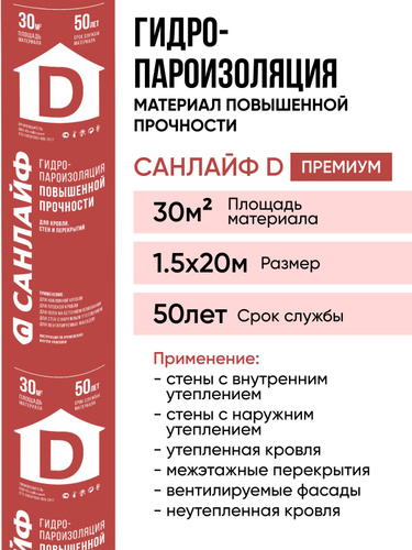 Пароизоляция САНЛАЙФ D ПРЕМИУМ, гидро-пароизоляционный материал повышенной прочности 30м2 (1,5х20м)