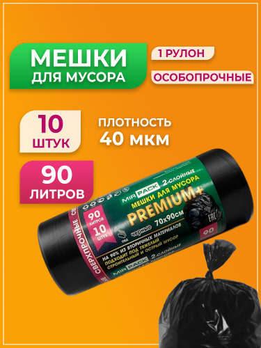 Мешки для мусора 90 л, 10 шт, 40 мкм, Особо прочные MirPack (Premium+) (черные)
