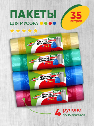 Мешки для мусора PakeTiki Серии Multi 35л с завязками,30мкр, набор 60шт-повышенной прочности, пакеты для мусора с перфорацией