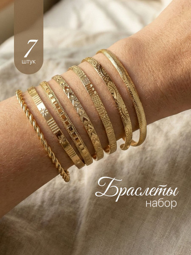 Браслет на руку многослойный тонкий набор JewelryMeverly, 7шт, золотистый цвет