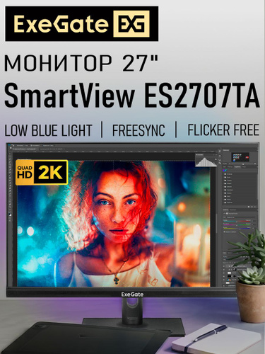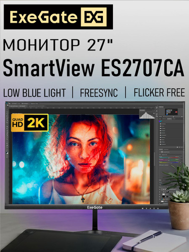 ExeGate 27" Монитор SmartView ES2707TA (IPS, 2K, 2560x1440@75Гц, 16:9, 250cd/m2, 1000:1, 178°/178°, 1ms, Speakers 2x3W, HDMI, DisplayPort, USB, audio-out, RGB-подсветка, Flicker-free, FreeSync, Low Blue Light, кабель HDMI 1.5м, VESA, регулировка высоты, регулировка наклона, поворот экрана, поворот экрана на 90°), черный