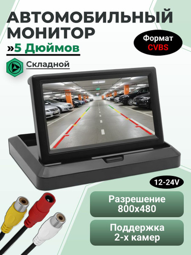 Монитор автомобильный 5 дюймов для камеры заднего и переднего вида (Поддержка формата CVBS, 2 видеовхода AV/RCA), Складной