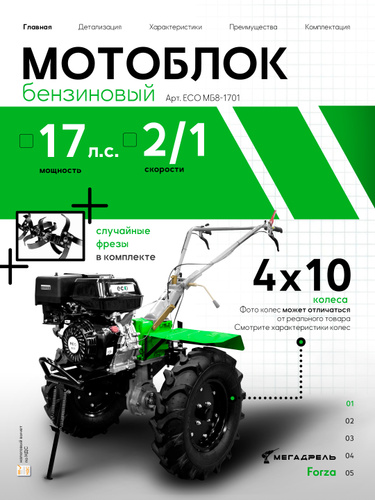 Мотоблок бензиновый 17 л.с, 12.5 кВт, 4 скорости вперед, 1 назад