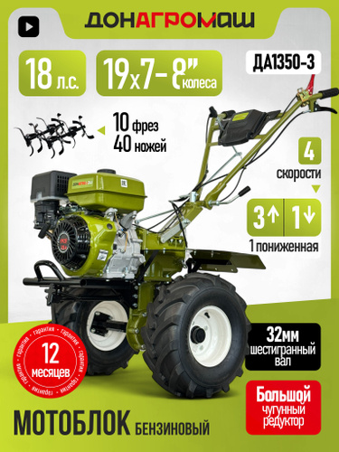 ДОНАГРОМАШ Мотоблок бензиновый редукторный ДА1350-3 (18 л.с, 3 вперед / 1 назад, колеса 19x7-8)