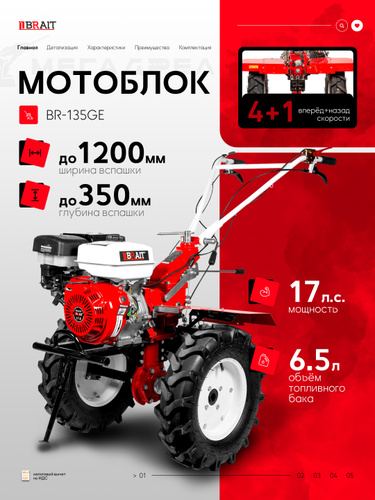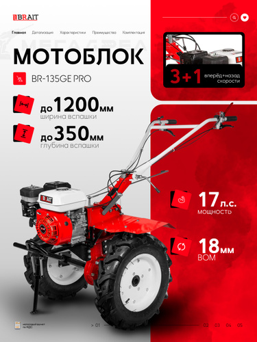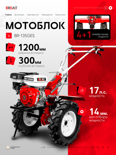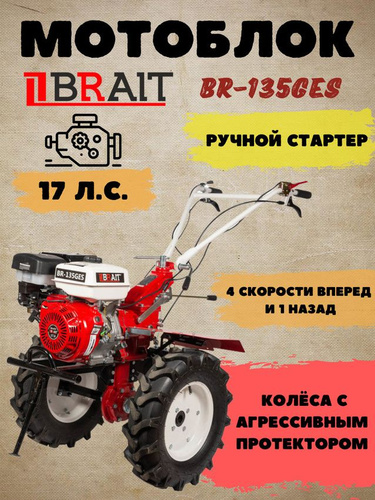 Мотоблок бензиновый BRAIT BR-135GES (17 л.с. 4 скорости вперед и 1 назад, глубина обработки 150-350 мм, ручной запуск) мотокультиватор
