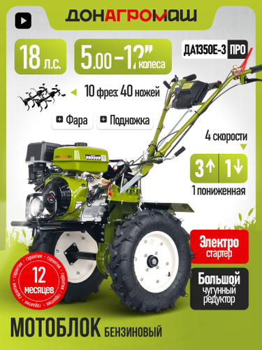 ДОНАГРОМАШ Мотоблок бензиновый редукторный ДА1350Е-3 ПРО (18 л.с, 3 вперед / 1 назад, колеса 5-12, электростартер, фара)