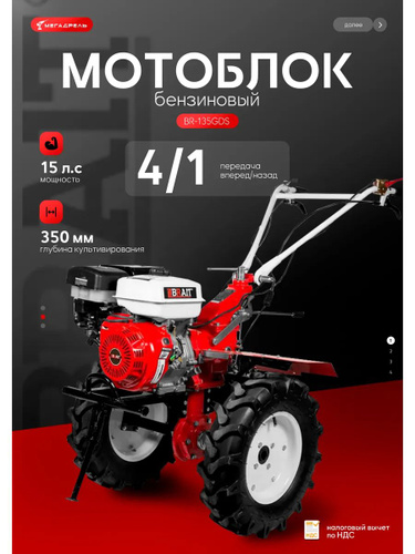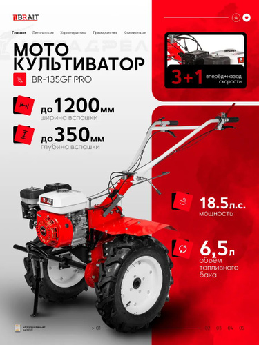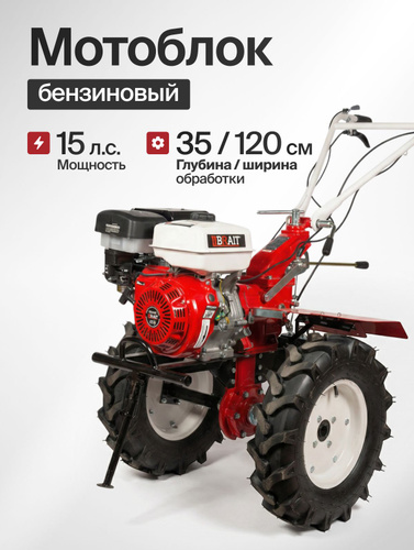 Бензиновый мотоблок BRAIT BR-135GDHPRO, мощность 15 л.с., количество передач 3/1 PRO, бензобак 6.5 л, колеса 5/12, мотоблок