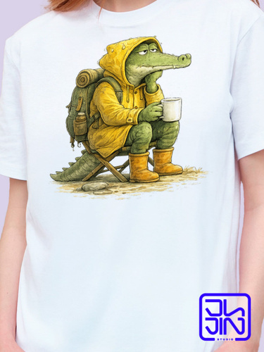 Футболка Jujin Studio классическая женская с авторским принтом Веселый крокодил в выразительной лимонной куртке с рюкзаком на кемпинге, белый хлопковый трикотаж с прикольным рисунком на груди