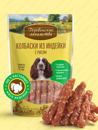 Лакомство для взрослых собак всех пород "Деревенские лакомства" Колбаски из индейки с рисом, 85 гр.