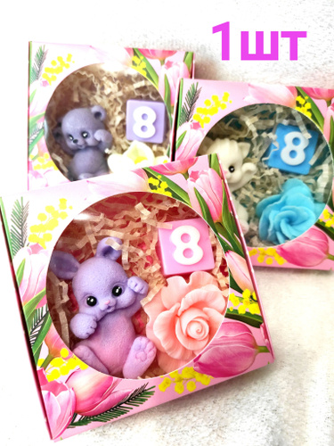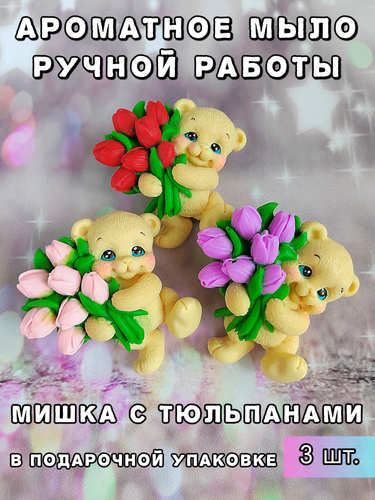Мыло ручной работы "Мишка с Тюльпанами" 3 шт. / Подарок на 8 марта / Подарок женщине, девушке