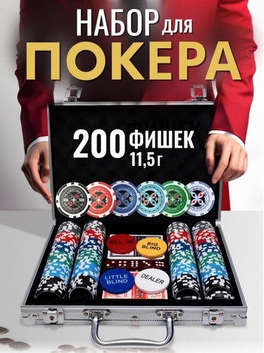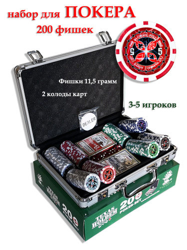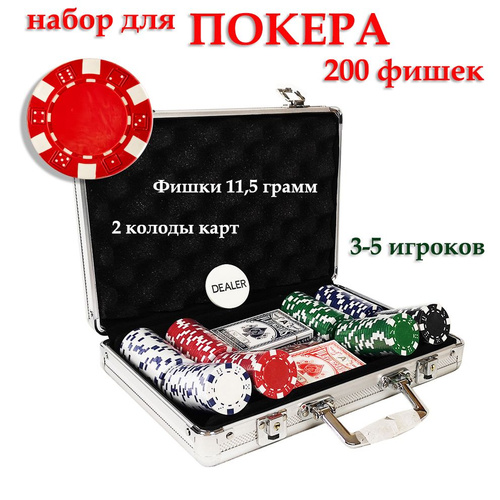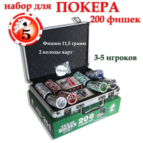 Покерный набор,набор для покера 200 фишек с номиналом (11,5г) в алюминиевом кейсе
