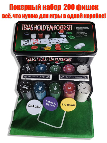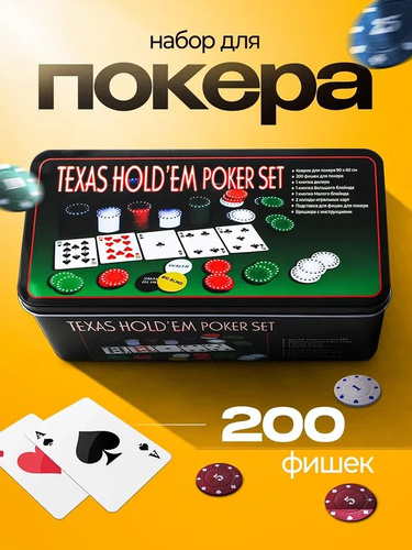 Покерный набор "Texas Holdem Poker" 200 фишек, в жестяной коробке / Фишки для покера / Набор казино