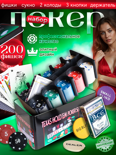 Набор для покера "Texas Holdem" 200 фишек, с номиналом, в жестяной подарочной коробке , Сукно в подарок, 2 колоды карт, фишки дилера, Настольные игры для взрослых