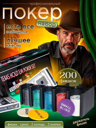 Покер "Texas Holdem Set" 200 фишек в железном кейсе