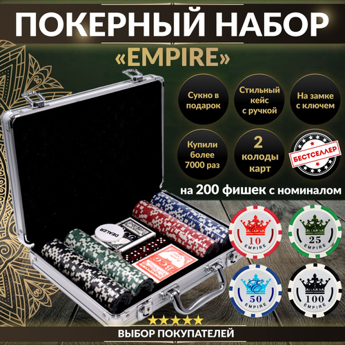 Покерный набор Empire, 200 фишек 11.5г, с номиналом, в алюминиевом кейсе, Сукно в подарок , Премиум набор для покера , Настольные игры для взрослых