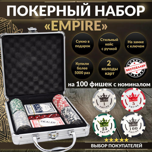 Покерный набор Empire, 100 фишек 11.5г, с номиналом, в алюминиевом кейсе, Сукно в подарок , Премиум набор для покера , Настольные игры для взрослых