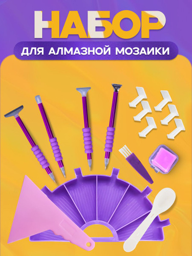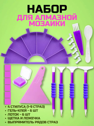 Набор для алмазной мозаики / Стилус 4 штуки, насадки для стилуса, клей 6 штук, лоток для страз, шпатель.