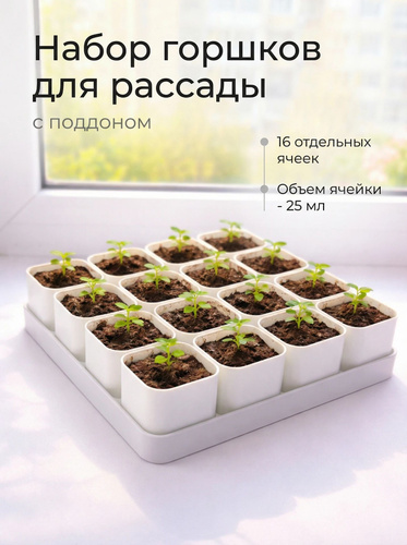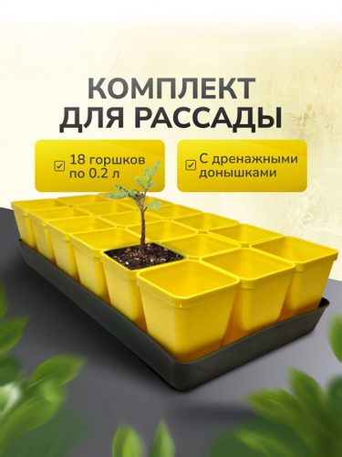 Набор для рассады с поддоном, горшки для выращивания (+ дренажные донышки), кассеты для рассады, цветов, овощей (18 штук по 200 мл)
